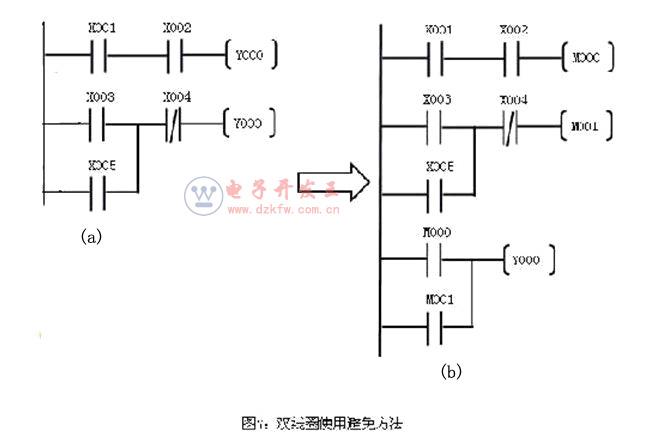 图(b)中,X001和X002接点控制辅助继电器M000,X003~X005接点控制辅助继电器M001,再由两个继电器M000,M001接点的并联组合去控制线圈Y000。这样逻辑关系没变,却把双线圈变成单线圈。