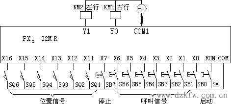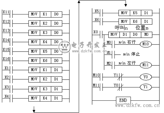 图中将送料车当前位置送到数据寄存器 D0 中,将呼叫工作台号送到数据寄存器 D1 中,然后通过 D0 与 D1 中数据的比较,决定送料车的运行方向和到达的目标位置。