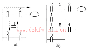 图1a中可能有两个方向的能流流过触点5(经过触点1、5、4或经过触点3、5、2),这不符合能流只能从左向右流动的原则,因此应改为如图1b所示的梯形图。