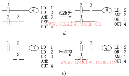 6)有几个串联电路相并联时,应将串联触点多的回路放在上方,如图2a所示。在有几个并联电路相串联时,应将并联触点多的回路放在左方,如图2b所示。这样所编制的程序简洁明了,语句较少。