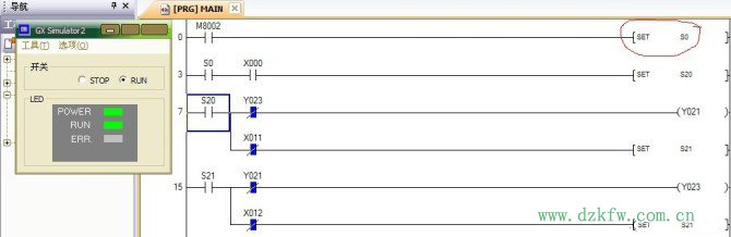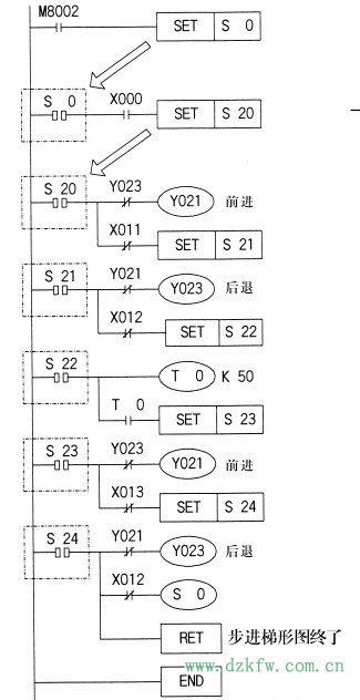 原来原来《编程手册》有关STL/RET指令的便例程序都是由FXGP(DOS)、FXGP(WIN)编写,使用GX-Developer及后来的GX-works编写梯形图程序时,STL及RET指令的书写规则并不像《编程手册》的例程序中那样。所以《编程手册》中的那个例程在GX-Developer或GX-works中编写时,梯形图程序应该是这样的: