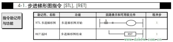 最近用三菱的FX2N PLC,想用一下它的步进功能指令(STL/RET)来做顺序功能控制。编程手册中对这两个指令的说明比较详细。下图是三菱FX系列编程手册中对于STL/RET指令的例程序。