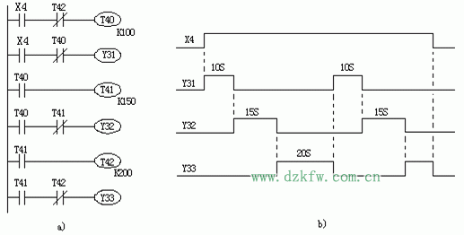 如图3a所示为用三个定时器产生一组顺序脉冲的梯形图程序,顺序脉冲波形如图3b所示。当X4接通,T40开始延时,同时Y31通电,定时l0s时间到,T40常闭触点断开,Y31断电。T40常开触点闭合,T41开始延时,同时Y32通电,当T41定时15s时间到,Y32断电。T41常开触点闭合,T42开始延时.(www.dzkfw.com.cn 版权所有)同时Y33通电,T42定时20s时间到,Y33断电。如果X4仍接通,重新开始产生顺序脉冲,直至X4断开。当X4断开时,所有的定时器全部断电,定时器触点复位,输出Y31、Y32及Y33全部断电。