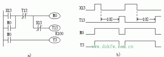 如图4所示为断开延时程序的梯形图和动作时序图。当X13接通时,M0线圈接通并自锁,Y3线圈通电,这时T13由于X13常闭触点断开而没有接通定时;当X13断开时,X13的常闭触点恢复闭合,T13线圈得电,开始定时。经过10s延时后,T13常闭触点断开,使M0复位,Y3线圈断电,从而实现从输入信号X13断开,经10s延时后,输出信号Y3才断开的延时功能。