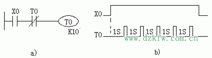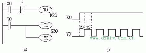 如图2所示为采用两个定时器产生连续脉冲信号,脉冲周期为5秒,占空比为3:2(接通时间:断开时间)。接通时间3s,由定时器T1设定,断开时间为2s,由定时器T0设定,用Y0作为连续脉冲输出端。