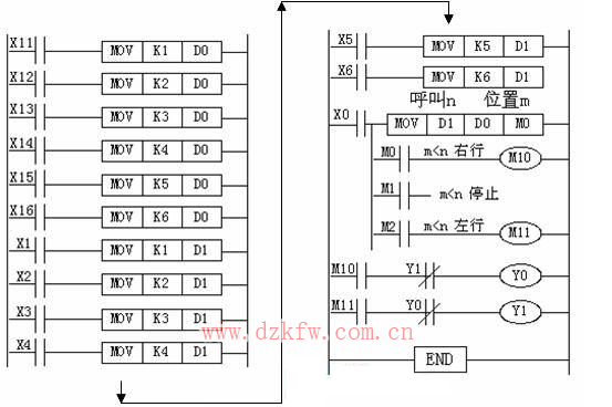 图中将送料车当前位置送到数据寄存器 D0 中,将呼叫工作台号送到数据寄存器 D1 中,然后通过 D0 与 D1 中数据的比较,决定送料车的运行方向和到达的目标位置。