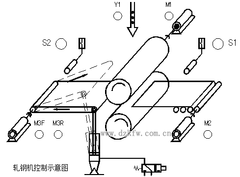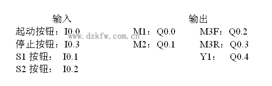 当起动按扭按下,电动机M1、M2运行,按S1表示检测到物件,电动机M3正转,即M3F亮。再按S2,电动机M3反转,即M3R亮,同时电磁阀Y1动作。再按S1 ,电动机M3正转,重复经过三次循环,再按S2时,则停机一段时间(3s),取出成品后,继续运行,不需要按起动。当按下停止按钮时,必须按起动后方可运行。必须注意不先按S1,而按S2将不会有动作。