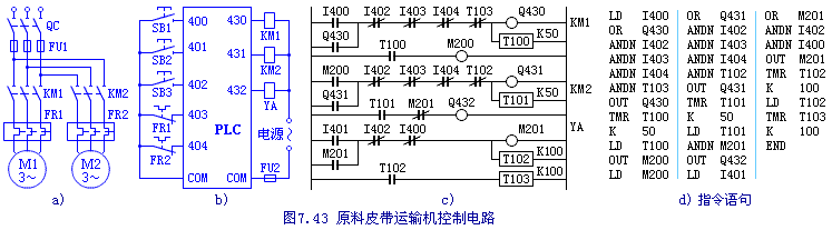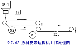 启动时,PD1启动5S后PD2启动,再过5s电磁阀YV动作供料;停止时,先停电磁阀,10s后再停PD2,再过10s才停PD1;紧急情况或过载时无条件全部停止。