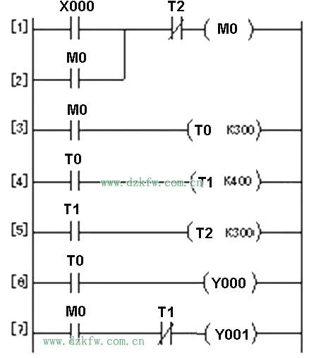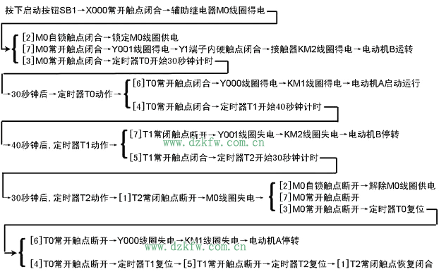 多定时器组合控制的plc线路与梯形图它可以实现的功能是:按下起动按钮后电动机B马上运行,30秒钟后电动机A开始运行,70秒后电动机B停转,100秒后电动机A停转。PLC线路与梯形图说明如下: