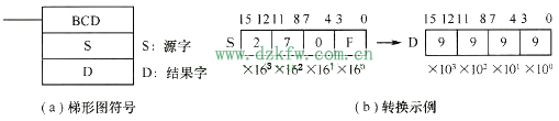 BIN到BCD转换指令是将源字中的16位二进制数转换成4位的BCD码,并输出到结果字中。其梯形图符号和转换示例如图所示。