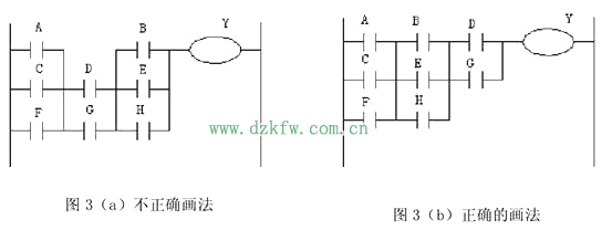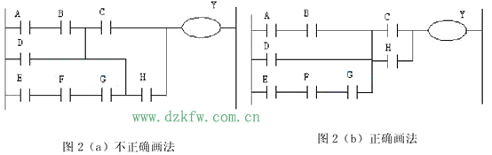 二、不包含触点的分支应放放在垂直方向,不应放在水平线上,这样便于看清触点的组和对输出线圈的控制路线,以免编程时出错。如图2所示。