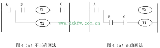 五、在画梯形图时,不能将触点画在线圈的右边,而只能画在线圈的左边,如图4所示。