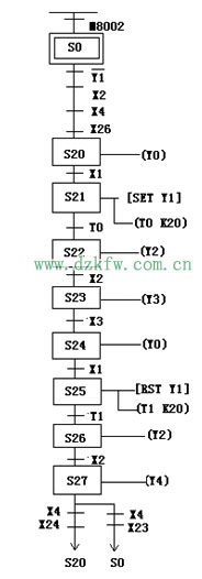 图4为机械手的自动连续运行状态转移图。每一状态对应机械手的一个工序。根据状态转移图很容易画出对应的步进梯形图。