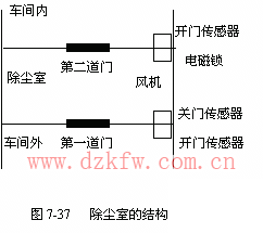 人或物进入无污染、无尘车间前,首先在除尘室严格进行指定时间的除尘才能进入车间,否则门打不开,进入不了车间。除尘室的结构如图7-37所示。图中第一道门处设有两个传感器:开门传感器和关门传感器;除尘室内有两台风机,用来除尘;第二道门上装有电磁锁和开门传感器,电磁锁在系统控制下自动锁上或打开。进入室内需要除尘,出来时不需除尘。