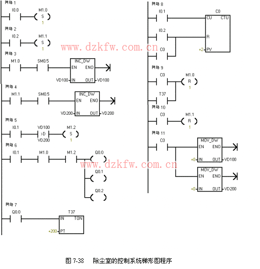 除尘室的控制系统梯形图程序如图7-38所示。4. 程序的调试和运行