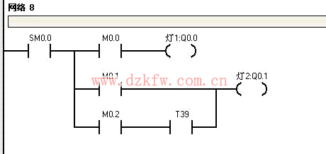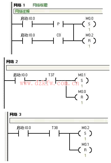 这3个网络就是这个程序的主干,这也是一个简单的顺序控制,这个顺序控制共有三步,分别与M0.0、M0.1、M0.2对应,每一次只有一步动作,前面的常开点是跳转条件。比如:I0.0与T37(5秒)将M0.1置位并将M0.0复位,而第一步因为除了I0.0启动这个条件外,还有一个循环的条件,所以第一步共有2个条件。