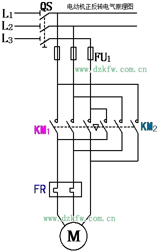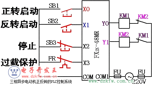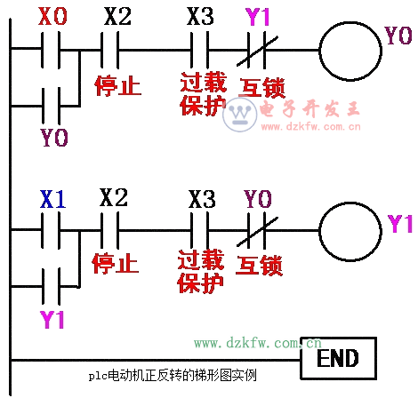 注意:虽然在梯形图中已经有了软继电器的互锁触点,但在外部硬件输出电路中还必须使用KM1、KM2的常闭触点进行互锁。因为PLC内部软继电器互锁只相差一个扫描周期,而外部硬件接触器触点的断开时间往往大于一个扫描周期,来不及响应。例如Y0虽然失电,可能KM1的主触点还未断开,在没有外部硬件互锁的情况下,KM2的主触点可能已接通,引起主电路短路。因此必须采用软硬件双重互锁。