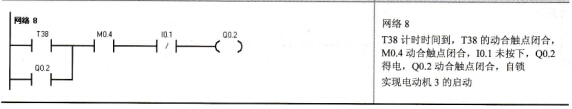 表7-4是使用比较指令编写的程序,在程序中电动机的启动和关断信号均为短信号。在表7-4中,采用通电延时定时器T37实现M2和M3的启动,采用断电延时定时器T38实现3台电动机的停止。T38的定时值设定为610,这使得再次按下启动按钮I0.0,T38不等于600的比较触点为闭合状态,M1能够正常启动。对比表7-3与表7-4的程序可以发现使用一些复杂指令,可以使程序变得简单。
