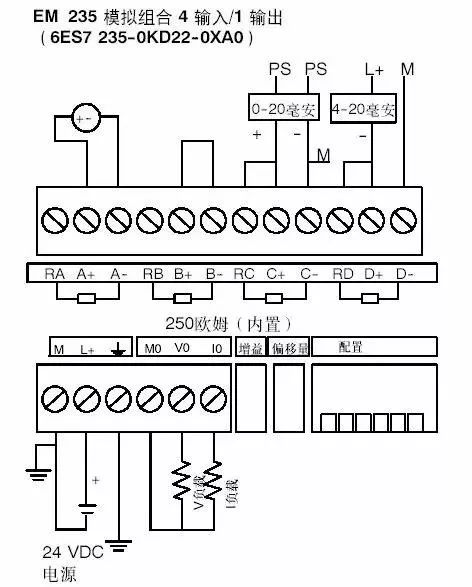 EM235是最常用的模拟量扩展模块,它实现了4路模拟量输入和1路模拟量输出功能。下面以EM235为例讲解模拟量扩展模块接线图,如图1。