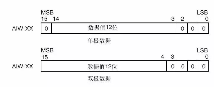 可见,模拟量到数字量转换器(ADC)的12位读数是左对齐的。最高有效位是符号位,0表示正值。在单极性格式中,3个连续的0使得模拟量到数字量转换器(ADC)每变化1个单位,数据字则以8个单位变化。在双极性格式中,4个连续的0使得模拟量到数字量转换器每变化1个单位,数据字则以16为单位变化。