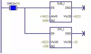 某压力变送器,当压力达到满量程5MPa时,压力变送器的输出电流是20mA,AIW0的数值是32000。可见,每毫安对应的A/D值为32000/20,测得当压力为0.1MPa时,压力变送器的电流应为4mA,A/D值为(32000/20)×4=6400。