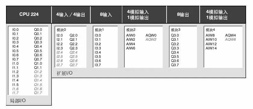 图4演示了CPU224后面依次排列一个4输入/4输出数字量模块,一个8输入数字量模块,一个4模拟输入/1模拟输出模块,一个8输出数字量模块,一个4模拟输入/1模拟输出模块的寻址情况,其中,灰色通道不能使用。