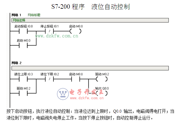 按下启动按钮,执行液位自动控制:当液位达到上限时,Q0.0输出,电磁阀得电打开;当液位到下限时,电磁阀失电停止工作。当按下停止按钮时,自动控制停止运行。非模拟量控制,通过限位开关的液位控制: