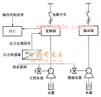 当用水量过大时,水压减小,控制装置得到水压减小信号,于是控制装置会提高水泵的转速来提升水压。同样,当用水量减少时,控制装置降低水泵的转速,减小水压。这样就可以保持水压恒定。一般情况下,变频调速器给水泵的电动机供电,以便得到较好的调速性能。