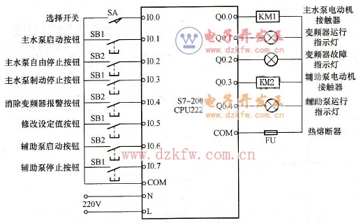 根据上述的恒压供水控制系统的工作原理及流程分析,可知该控制系统中的输入信号有:主水泵启动按钮1个,主水泵自由停止按钮1个,主水泵制动停止按钮1个,工作方式选择开关1个,辅助泵启动按钮1个,辅助泵制动停止按钮1个,修改系统设定值按钮1个,清除变频器报警按钮1个,所以共需要8个输入端子。
