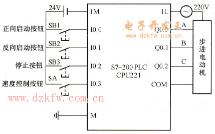 步进电动机PLC控制系统的硬件组成示意图如图7-33所示,由该组成示意图可知,步进电动机PLC控制系统的输入信号有:电动机正向、反向和停止按钮各1个,控制其运行速度的按钮1个,共有4路输入信号,需4个输入端子。
