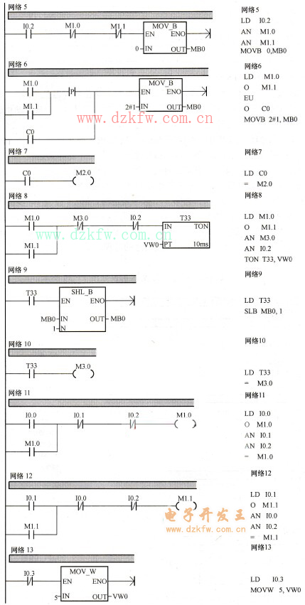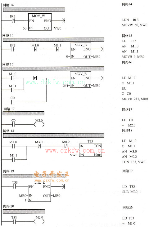 图7-36 步进电动机控制系统的PLC程序梯形图及语句表