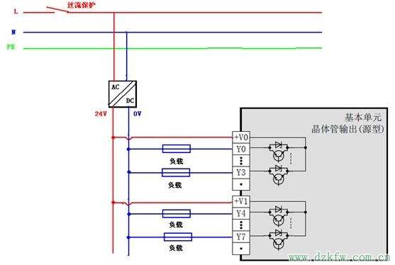 如果是继电器输出的PLC在接线的时候应该注意电压的范围,对于直流应使用DC30V以下,对于交流应使用AC240V以下的电源。接线图如图所示: