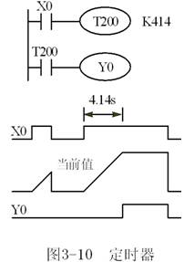 常数K可以作为定时器的设定值,也可以用数据寄存器(D)的内容来设置定时器。例如外部数字开关输入的数据可以存入数据寄存器,作为定时器的设定值。通常使用有电池后备的数据寄存器,这样在断电时不会丢失数据。