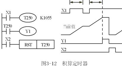 100ms积算定时器T250~T255的定时范围为0.1~3276.7s。X1的常开触点接通时(见图3–12),T250的当前值计数器对100ms时钟脉冲进行累加计数。X1的常开触点断开或停电时停止定时,当前值保持不变。X1的常开触点再次接通或重新上电时继续定时,累计时间(t1+t2)为1055×100ms=105.5s时,T250的触点动作。因为积算定时器的线圈断电时不会复位,需要用X2的常开触点使T250强制复位。