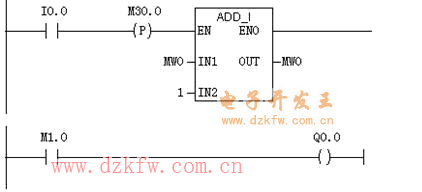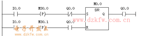 即用一个SR触发指令实现,其I0.0为启动按钮,Q0.0为控制输出端。Q0.0=1为启动运行。Q0.0=0为停止运行。
