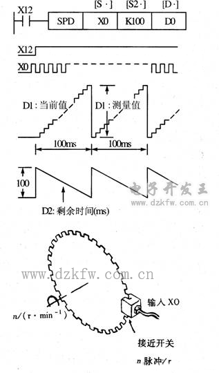 速度检测指令SPD的编号为FNC56。它的功能是用来检测给定时间内从编码器输入的脉冲个数,并计算出速度。如图5所示,[D. ]占三个目标元件。当X12为ON时,用D1对X0的输入上升沿计数,100ms后计数结果送入D0,D1复位,D1重新开始对X0计数。D2在计数结束后计算剩余时间。