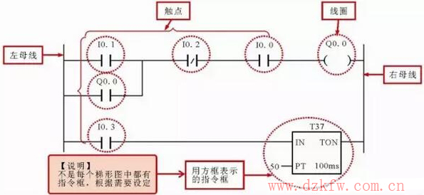 在西门子PLC梯形图中,左右两侧的母线分别称为左母线和右母线,是每条程序的起始点和终止点,也就是说梯形图中的每一条程序都是始于左母线,终于右母线的。