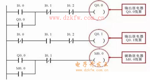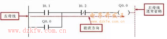 一般情况下,西门子PLC梯形图编程时,习惯性的只画出左母线,省略右侧母线,但其所表达梯形图程序中的能流仍是由左母线经程序中触点I0.1、I0.2、线圈Q0.0等至右母线中的过程,如图2所示。