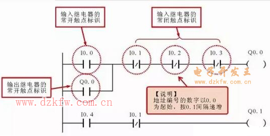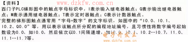 在西门子PLC梯形图中,触点可分为常开触点和常闭触点,其中常开触点符号为“-| |-”,常闭触点符号为“-|/|-”,可使用字母I、Q、M、T、C进行标识,且这些标识一般写在其相应图形符号的正上方,如图3所示。