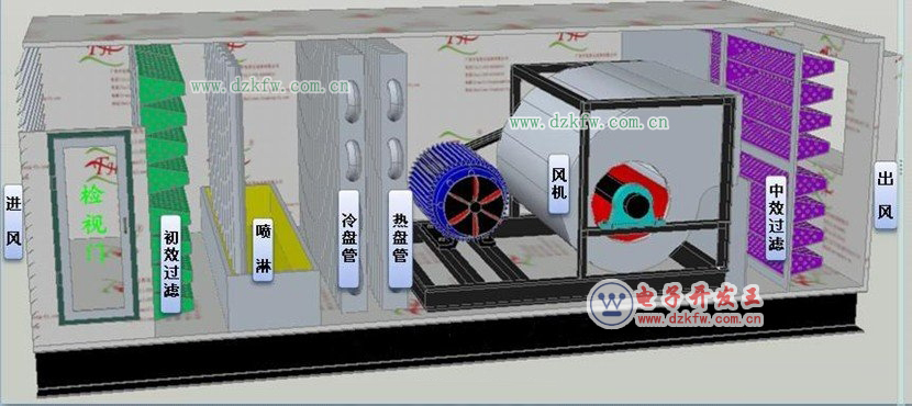 风机鼓入的新风经加热交换器、制冷交换器、进入房间。原理说明:进风不断被受热体加温,欲使进风维持一定的温度,这就需要同时有一加热器以不同加热量给进风加热,这样才能保证进风温度保持恒定。