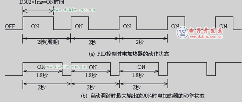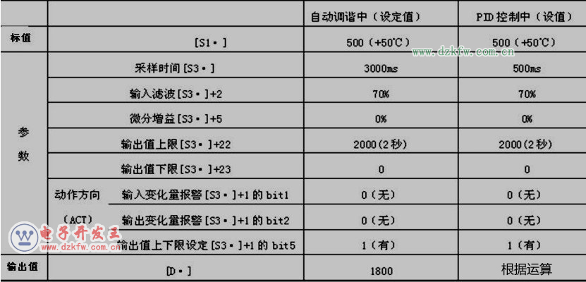 在温度控制系统中,电加热器加热,温度用热电耦检测,与热电耦型温度传感器匹配的模拟量输入模块 FX2N-4AD-TC将温度转换为数字输出,CPU将检测的温度与温度设定值比较,通过PLC的PID控制改变加热器的加热时间从而实现对温度的闭环控制。PID控制时和自动调谐时电加热器的动作情况如上图所示。其参数设定内容如下表所示。