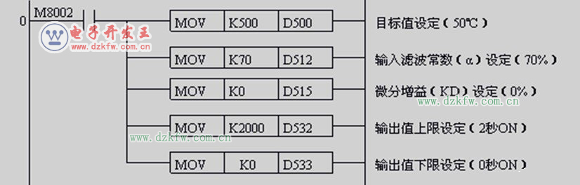 当选择开关置X10时,控制用参数的设定值在PID运算前必须预先通过指令写入,见图程序0步开始,M8002为初始化脉冲,用MOV指令将目标值、输入滤波常数、微分增益、输出值上限、输出值下限的设定值分别传送给数据寄存器D500、D512、D515、D532、D533。