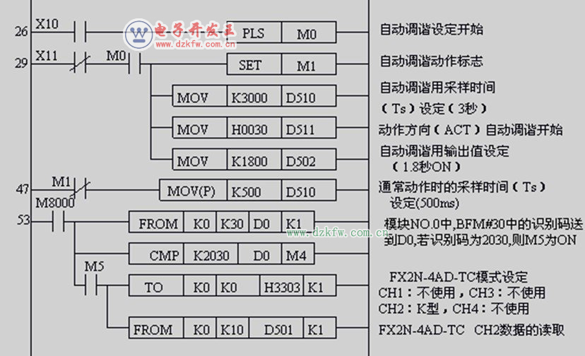 程序第26步,使M0得电,使用自动调谐功能是为了得到最佳PID控制,自动调谐不能自动设定的参数必须通过指令设定,在第29步~47步之间用MOV指令将自动调谐用的参数(自动调谐采用时间、动作方向自动调谐开始、自动调谐用输出值)分别传送给数据寄存器D510、D511、D502。