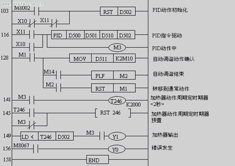 第116步开始,X10闭合,在自动调谐后实行PID控制,当自动调谐开始时的测定值达到目标值的变化量变化1/3以上,则自动调谐结束,程序第128步~140步,自动调谐结束,转移到通常动作,M1复位。