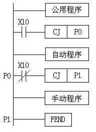 将系统的程序按工作方式和功能分成若干部份,如:公共程序、手动程序、自动程序等部份。手动程序和自动程序是不同时执行的,所以用跳转指令将它们分开,用工作方式的选择信号作为跳转的条件。如图所示为一个典型的具有多种工作方式的系统的程序的总体结构。选择手动工作方式时X10为“1”状态,将跳过自动程序,执行公用程序和手动程序;选择自动工作方式时X10为“0”状态,将跳过手动程序,执行公用程序和自动程序。确定了系统程序的结构形式,然后分别对每一部份程序进行设计。