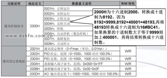 分析:想要通过通信控制启停和频率,必须将运行指令通道设置成通信给定P00.01=2,频率指令选择设置成MODBUS通信设定P00.06=8。有关通信组的参数采用默认值,本机通信地址P14.00=1,通信波特率P14.01=4(19200bps),数据位校验格式P14.02=1(偶检验E,8,1 for RTU)。