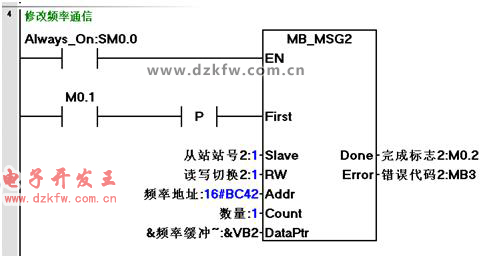3.编写修改频率的程序。同样的方法换算出控制频率的通信地址为16#BC42,程序如图1-5所示。