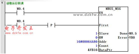 5.编写读取运行转速程序,同理得出运行转速地址为16#64A86,程序如图1-8所示。