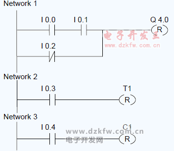 说明:只有在前面指令的RLO为“1”(能流通过线圈)时,才会执行---( R )(复位线圈)。如果能流通过线圈(RLO为“1”),将把单元的指定<地址>复位为“0”。RLO为“0”(没有能流通过线圈)将不起作用,单元指定地址的状态将保持不变。<地址>也可以是值复位为“0”的定时器(T编号)或值复位为“0”的计数器(C编号)。
