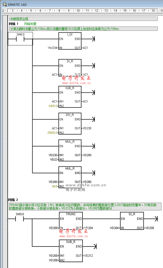 很多人会认为没有问题,但实际情况是此程序在运行一段时间后就将出现错误。此程序在运行之初是正常的,因为累计流量初始值及流量瞬时值都为一个很小的浮点数,两数相加后,结果正确。但是当一段时间后,累计流量的数值逐渐增大,当它与瞬时流量的数值相差很远的时候,两者执行加法操作后,瞬时流量的数值将被忽略掉(如9999990.0与0.2做加法操作)。其实具备计算机常识的人都应当清楚这一点,这是由于浮点数的存储机制造成的,是所有计算机方面编程都需要考虑的问题。这个问题可以通过使用二次累加或多次累加的方法来解决。所以在编程时应避免数量级相差太多的浮点数之间进行运算。很多人反映“加法指令不好用了”,很有可能就是数量级相差很多的实数进行了加法运算。